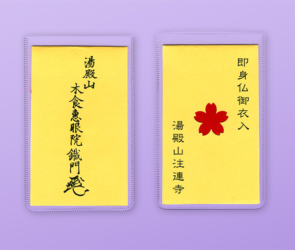江戸時代、神と呼ばれた木食行者、鉄門海は来世の人々の願いを叶えるために1829年即身仏となられました。 上人様が身に付けていたお衣を皆様のお側で願いを叶え、心の支えとなるようカード式のお守りに致しました。